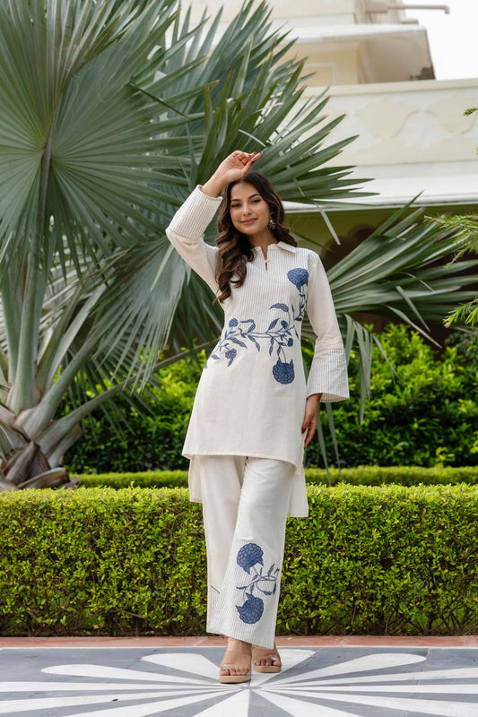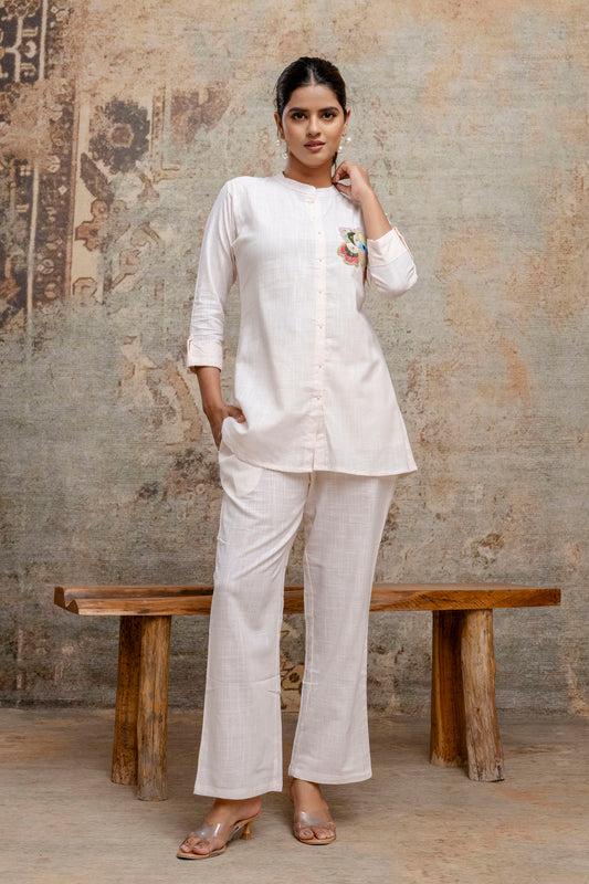 Elegant White Cotton Co-ord Set with Hand Embroidered Floral Motif