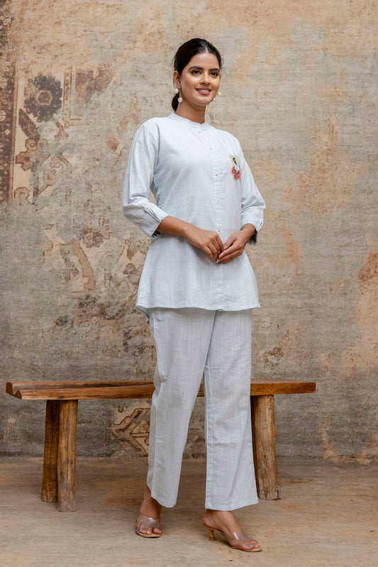Sky Blue Blend Cotton Co-ord Set with Hand Embroidered Sequin Motif