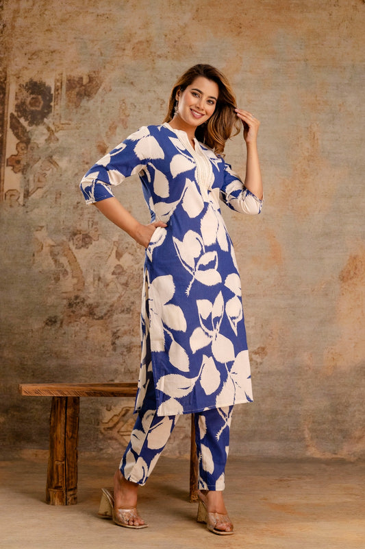 White & Blue Floral Pure Cotton Co-ord Set with Straight Pants