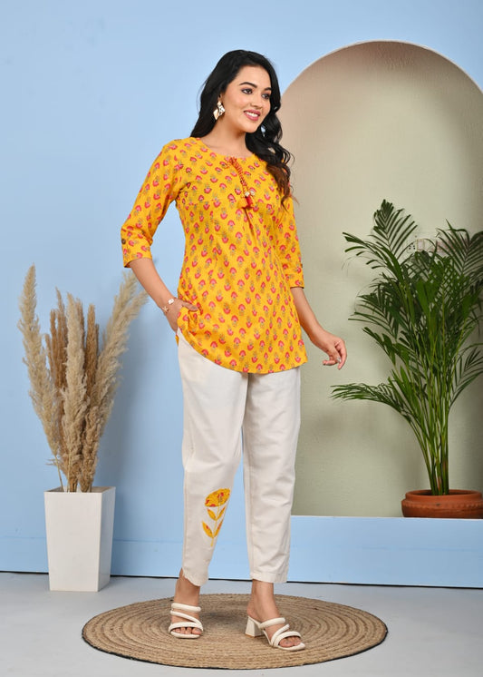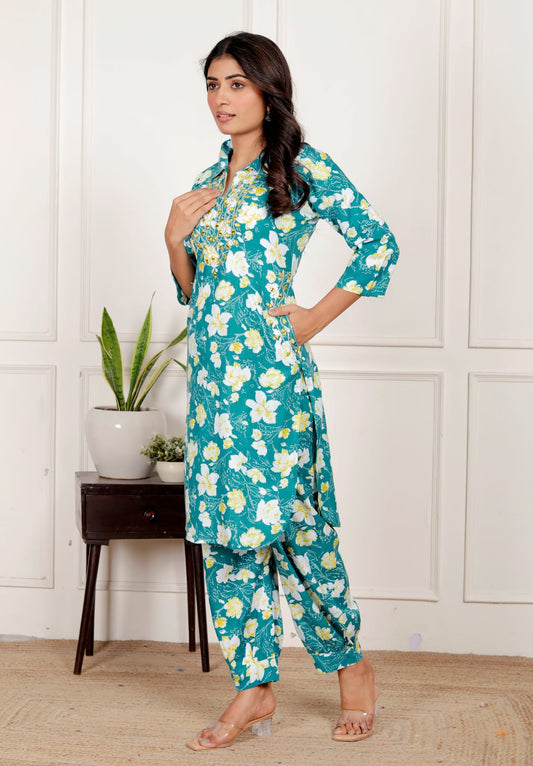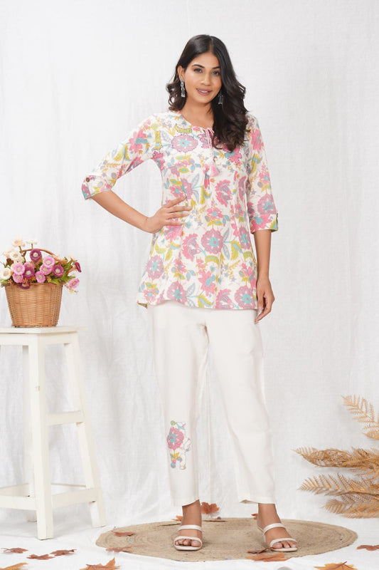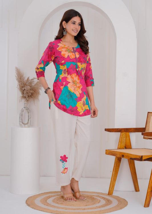 Vibrant Floral Printed Co-ord Set for Women – Short Kurti and Embroidered Pant