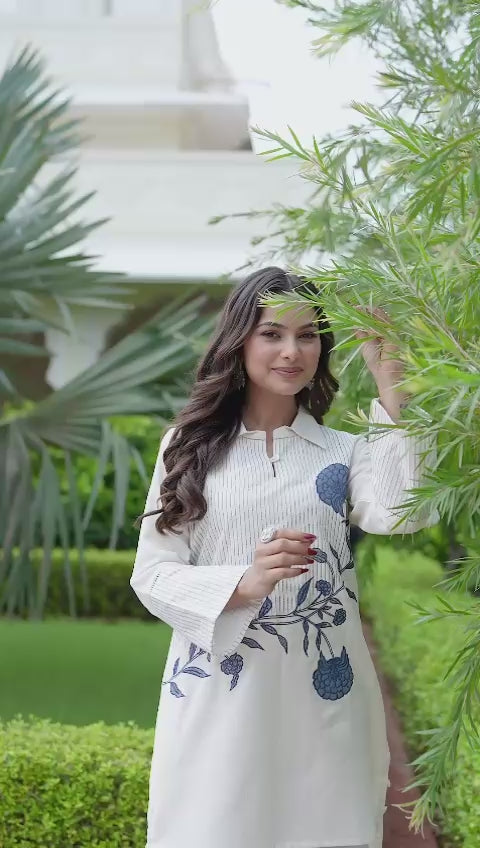 Effortlessly elegant and timeless, this ivory cream co-ord set is crafted in soft cotton for all-day comfort and charm. The kurta features vertical pin-tuck style lines with intricate blue floral thread embroidery blooming across the front and matching embroidery on the pants. With a smart collared neckline, flared sleeves with pin-tuck detailing, and high-low hemline, this set blends classic style with contemporary flair. The straight-fit pants mirror the embroidery on the kurta for a well-coordinated look, perfect for brunches, day events, or casual office wear.